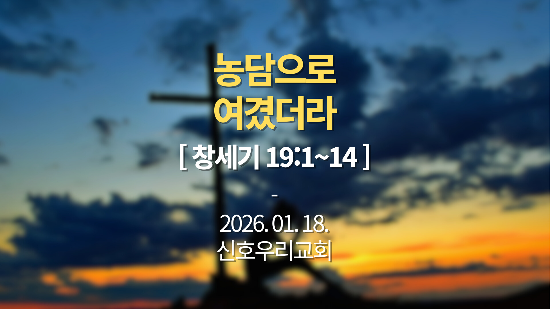 26년 예배 영상 260118 신호우리교회관리자 2026. 1. 18. 12:49 설교 제목: 농담으로 여겼더라 설교 본문: 창세기 19:1~14 설교자: 이태백 목사 공유하기 게시글 관리 신호우리교회 '26년 예배 영상' 카테고리의 다른 글 260201 (0) 2026.02.01 260104 (0) 2026.01.04 '26년 예배 영상' Related Articles 260201 260104